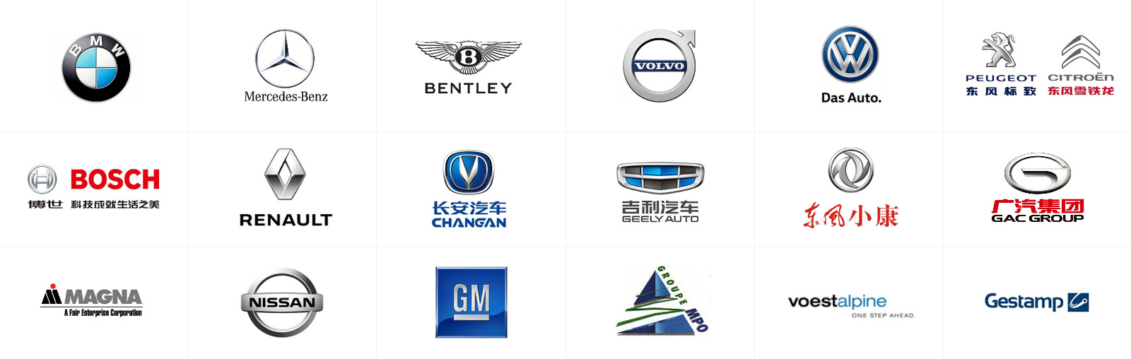 使用我們研發(fā)、設計的模具所制造的沖壓件,配套應用于賓利、VOLVO、奔馳、寶馬、標致雪鐵龍、雷諾、尼桑、大眾、通用等全球知名汽車集團旗下的眾多車型。